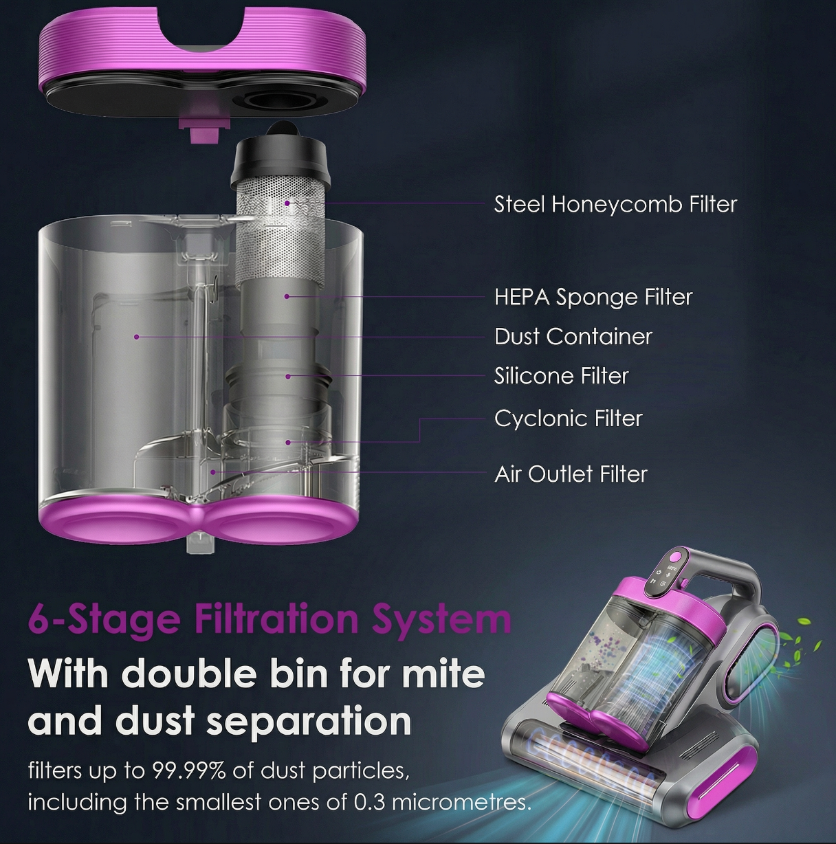 Powered by advanced filtration technology, it removes 99.91% of fine dust particles. Additionally, our mattress vacuum features an easy-to-use design that allows effortless removal and cleaning of the filter. With the extra filter, you can significantly extend the lifespan of your mattress vacuum.